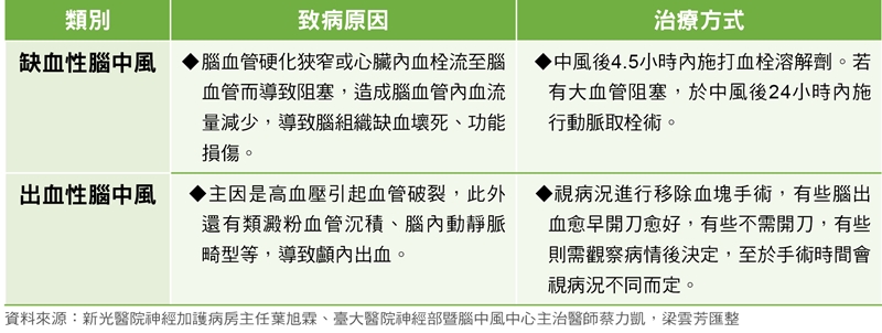 透過檢查了解出血狀況後,若確診為缺血性腦中風,在發病4.5小時內必須施打血栓溶解劑,或在24小時內透過動脈導管手術移除血栓,以便達到最佳療效;若確診為出血性腦中風,會視病情需要,決定是否緊急進行移除血塊的手術。