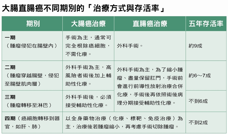 第三期腸癌,癌細胞已轉移到淋巴結,除了手術切除部分腸子與淋巴結,藉此根除癌細胞,針對肉眼無法看見的癌細胞,輔助型化療為必要治療。到了第四期,癌細胞已遠端轉移,則以「化學治療合併標靶治療或免疫治療」為主。梁逸歆醫師補充,第四期患者單純使用化療,存活期約一年半;化療加上標靶治療,存活期突破一倍以上,約存活25~30個月(註3、4)。