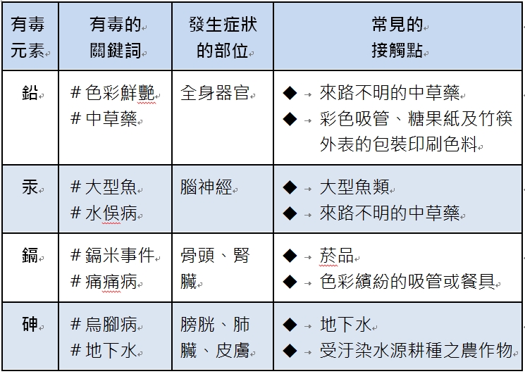 有毒金屬很多,以下介紹鉛、汞、鎘、砷等4大常見的有害微量元素,在哪些飲食情況下易接觸,應小心避免,以及中毒時會引發哪些症狀。