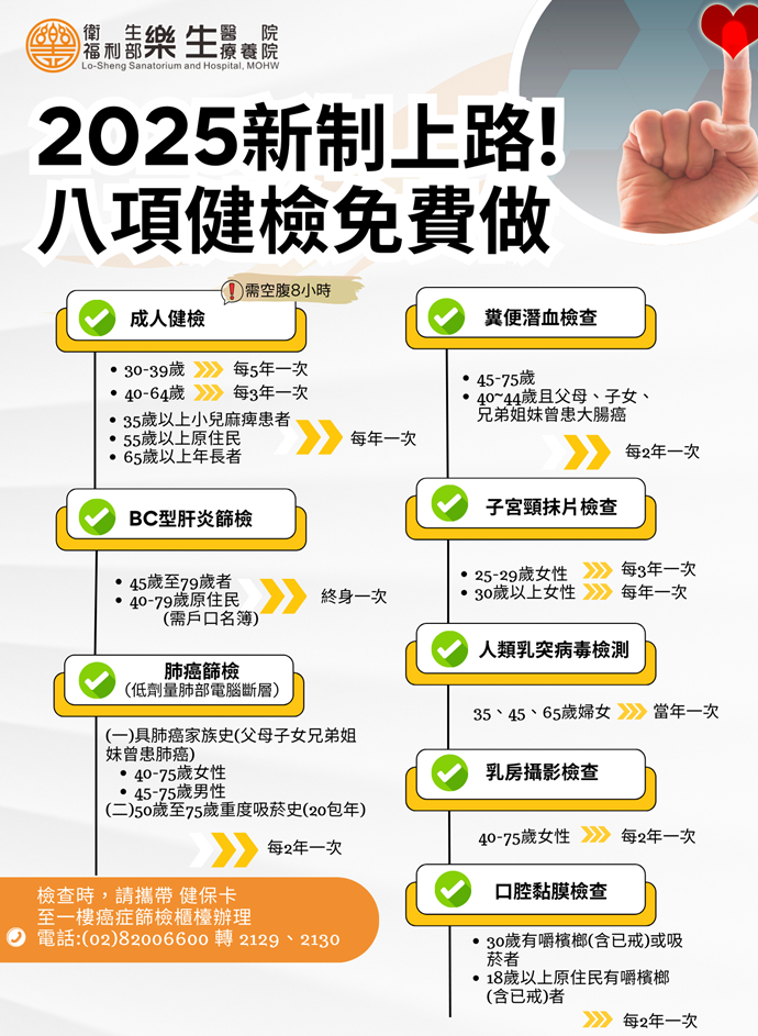 樂生醫院家醫科主任郭紋翠醫師表示,國健署自2025年起放寬4大癌篩檢資格,除了肺癌,乳癌、子宮頸癌、大腸癌可免費篩檢的年齡層都下修,最小25歲即可篩檢。政府提供8項免費健檢,符合資格者可洽樂生醫院癌症篩檢櫃台辦理。