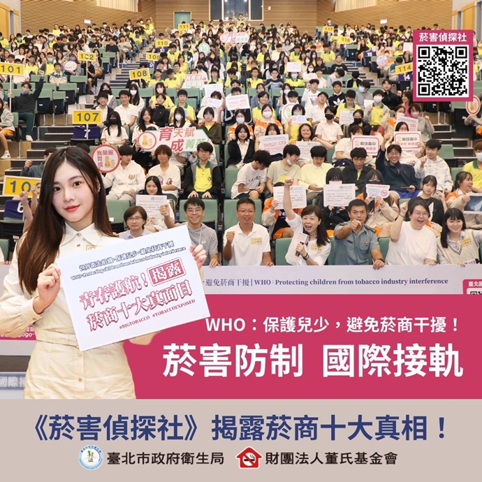 過去十餘年,菸商用新的技術與騙局,力推「新興菸品」、行銷「尼古丁」。臺北市政府衛生局結合董氏基金會,邀請臺大醫院家醫部江建勰醫師拍攝《菸害偵探社》8分鐘短片,從WHO的「菸商最愛年輕人」破題,緊接著探討「新興菸品―新的科技、新的騙局」、「水菸也是菸」、「沒有替代,只有危害」、「菸商的減害謊言」、「多重成癮」、「EVALI電子煙肺傷害」、「地球付出的代價」、「菸商行銷騙局」及「糖衣毒藥」等菸商真面目,試圖帶著年輕人一起挖掘新興菸品危害真相、揭露菸商騙局。