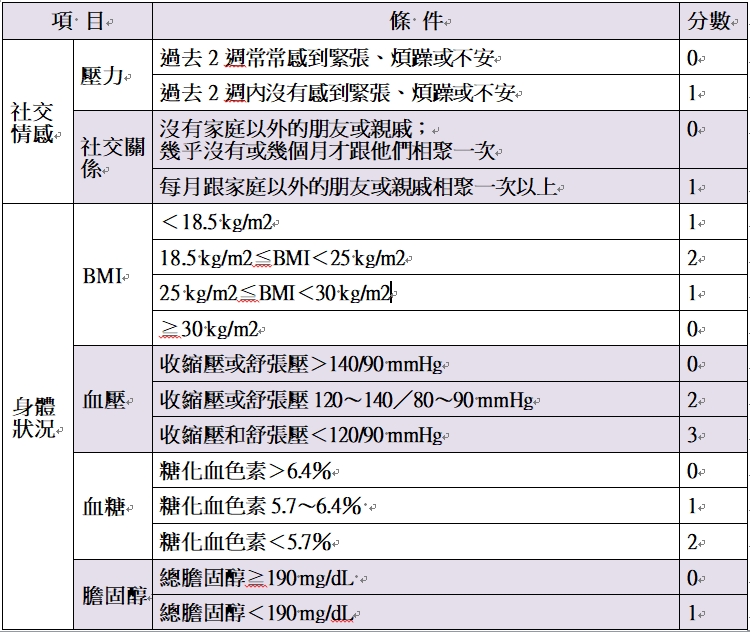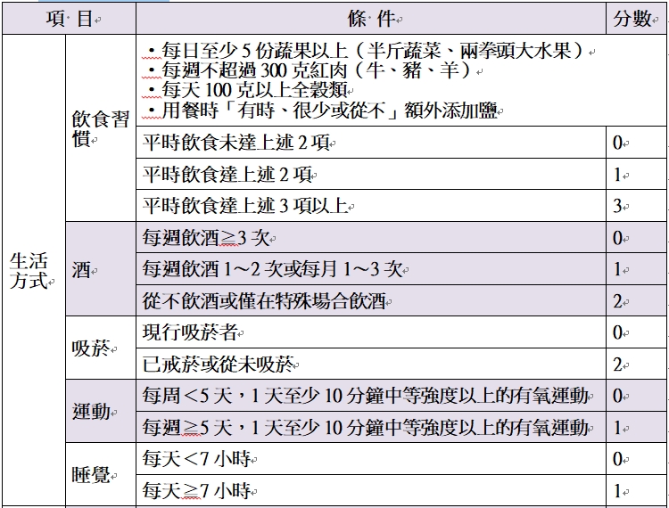 評分表中,不吸菸或已戒菸可得2分;每晚睡足7小時可得1分;每月與朋友或親戚相聚可得1分;不飲酒或僅在特殊場合飲酒又可得2分,每天達5份蔬果、少紅肉、攝取全穀類等可得3分。