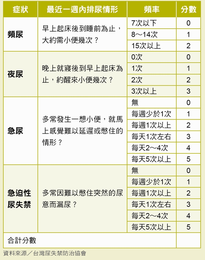 近年來隨著衛教知識的普及,泌尿道問題不再像過去難以啟齒,為了讓更多人警覺膀胱過動症,日本泌尿科醫師北村慎一提出「膀胱過動症症狀評分表」,從頻尿、急尿、夜尿及急迫性尿失禁四大方面評估,總分≧3分即符合膀胱過動症診斷標準。