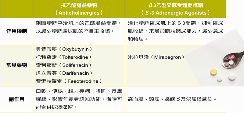 許多患者擔心長期吃藥會有副作用,隨著新型藥物的開發,副作用已逐漸改善,中重度膀胱過動症患者目前以抗乙醯膽鹼藥物或β3乙型交感受體促進劑為主要藥物,在醫師考量下可合併使用,等到症狀改善、不至於嚴重影響生活時,可再與主治醫師討論減藥或逐漸規劃停藥。