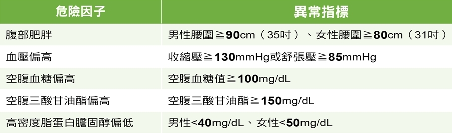 雙和醫院副院長、神經內科主治醫師陳龍表示,代謝症候群是對健康有威脅的警訊,是指還未惡化為疾病的前期階段,不妥善控制,會增加腦中風1.5倍機會。代謝症候群是指「三高、一沒有」的五項指標,三高是「高血壓、高血糖、高血脂」的指標,一沒有是指「沒有運動」造成的「肥胖與腰圍過粗」,血壓可經血壓計測量,血糖及血脂要抽血檢查,肥胖需計算身體質量指數(BMI=體重(公斤)/身高的平方(公尺2)),腰圍則可用皮尺測量。依衛福部國民健康署制定代謝症候群標準,只要5項異常指標中,3項以上高於標準就代表有代謝症侯群。