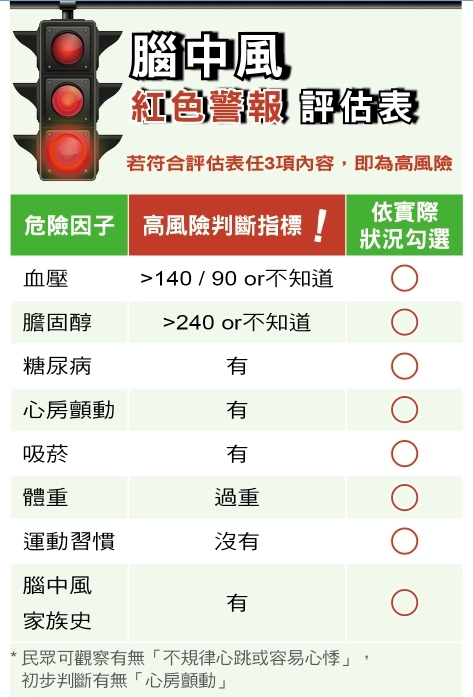 如果已有代謝症候群,想判斷是否為腦中風的高危險族群,可參考衛福部國民健康署及台灣腦中風學會設計的「腦中風紅色警報評估表」。8項指標若有3項符合,即為高風險,必須及早控制。