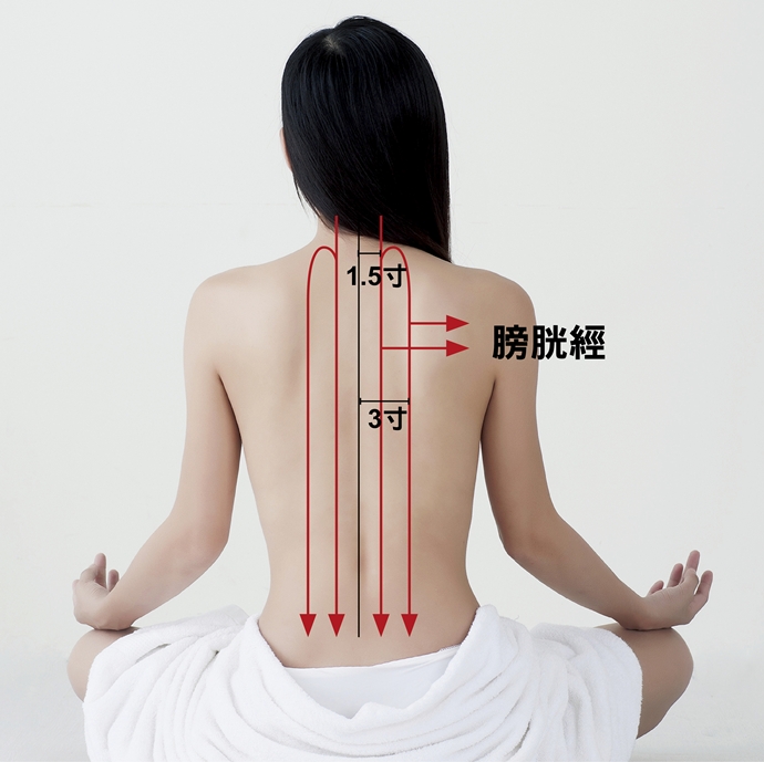 賴睿昕院長表示,頸部、背部、腿部等肌肉豐厚處較適合刮痧。林川祥院長補充,順序上可先刮後頸部,次刮背部,再刮胸部,最後刮四肢。從中醫經脈來論,刮痧首選膀胱經,這是從頭頂沿著肩胛骨下至背部脊椎兩側,經尾椎、臀部,再到腳底的經脈,不僅是人體最外層的防護罩,也是人體垃圾排泄通道。當外邪入侵造成身體不適時,可從頭到腳刮膀胱經的路線,脊椎兩側的刮痧範圍可用肋骨為準(見圖)。熱氣排除後,有助氣血循環。