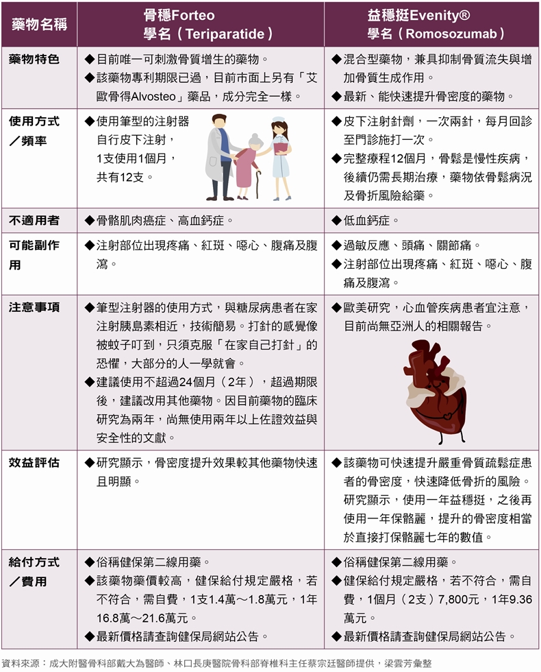 長庚大學醫學系教授、林口長庚紀念醫院脊椎科主任蔡宗廷說明,副甲狀腺素藥物是人工合成的副甲狀腺素,可促使骨骼釋放出鈣,協助身體維持鈣和磷在體內的平衡,增進骨骼及牙齒的強度。近年來研究發現,間歇使用副甲狀腺激素,可直接作用於造骨細胞上,除增加骨密度外,也能大幅降低骨折發生率,目前有骨穩(Forteo)及生物相似性藥品艾歐骨得Alvosteo,是俗稱的健保第二線藥物。