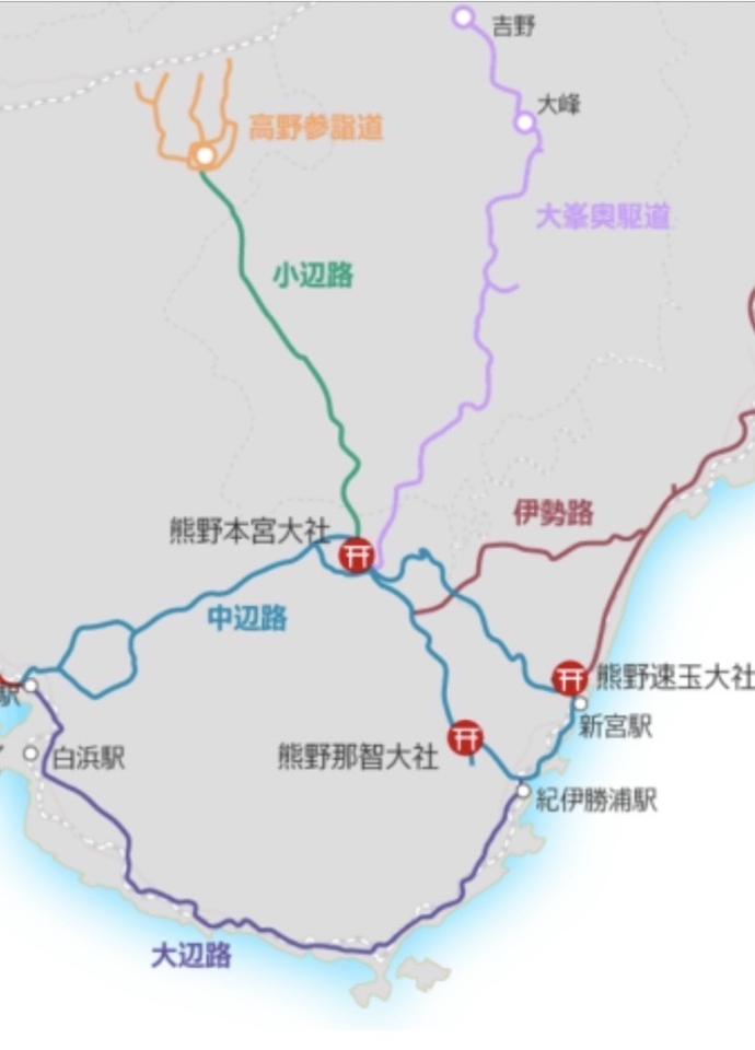 隨著時間演進,越來越多朝聖者從日本的四面八方前往熊野三山,因此產生了六條主要朝聖路線:由伊勢神宮到熊野三山的「伊勢路」、連接京都、大阪的「紀伊路」、由田邊市向東連接熊野三山的「中邊路」、連接高野山與熊野本宮大社的「小邊路」、連結吉野、熊野與熊野三山,被稱為宗教修練道的「大峰奧丘道」、以及從紀伊田邊的沿海岸線步行的「大邊路」。