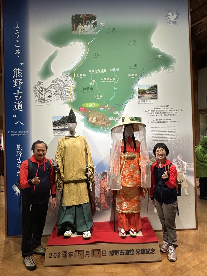 圖說:我和太太在「熊野古道館」與當時朝聖的信徒衣著合影。現在很多人從這裡開始走古道,旁邊是瀧尻王子神社,到本宮大社有38公里,走3天才會到!