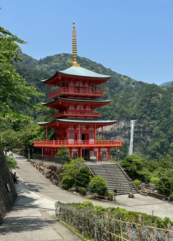圖說:青岸渡寺的三重塔,與旁邊的那智瀑布一起,是紀伊山區最美的景點。青岸渡寺是神社群中的佛寺,明治維新時期神佛分離的見證!