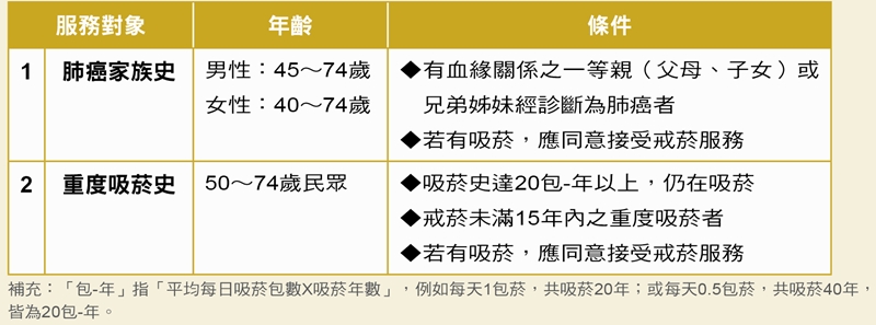 衛福部國健署自2022年7月1日起開辦「肺癌早期偵測計畫」,提供肺癌高危險族群LDCT篩檢。2025年擴大肺癌篩檢服務對象,符合下列任一條件者,每兩年可接受一次免費補助。