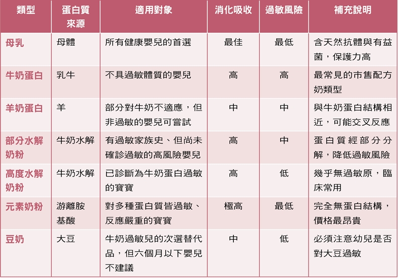 寶寶因過敏要減量或暫停喝母乳的期間,怎麼挑選合適的配方奶?朱君浩醫師說明,配方奶可分為「牛奶蛋白」、「羊奶蛋白」、「部分水解奶粉」、「高度水解奶粉」及「元素奶粉」,以下分析每一種配方奶適用的對象、消化吸收的效果及過敏風險: