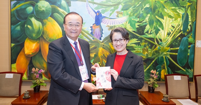圖說:中華捐血運動協會理事長侯勝茂(左)贈送由台灣血液基金會出版《身體之河:血液探索之旅》給蕭美琴副總統。(圖/總統府提供)