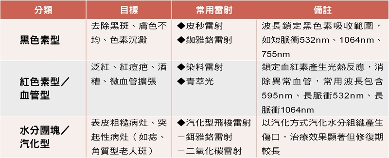 針對不同來源與深淺的斑點,需選擇合適的光電治療,黃昭瑜主任指出,雖然光電療程名稱繁多,但主要仍分為兩大類:脈衝光與雷射,兩者在能量、波長、修復期與作用方式上皆不同。