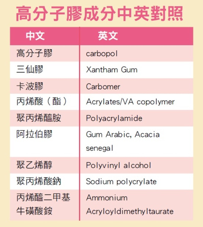 雖然玻尿酸、高分子膠都是濃度愈高,精華液愈濃稠,但在成本考量下,業者通常無法放入高濃度的玻尿酸,而以高分子膠來製造稠度,如此可形成有效成分濃度高的假象。要如何分辨高分子膠?可以看成分,例如三仙膠、卡波膠、丙烯酸(酯)、聚丙烯醯胺、阿拉伯膠等都是高分子膠。