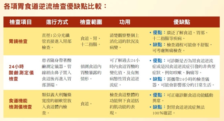 胃鏡檢查屬於間接性診斷,並非百分之百精準,對於用藥治療的評估與療效有所限制,所以臨床上,真正可確立胃食道逆流診斷之檢查,應屬「24小時酸鹼測定儀檢查」。