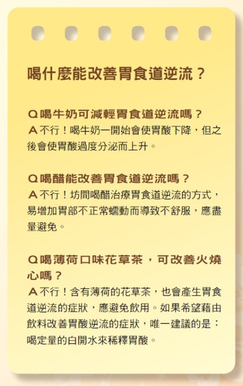 楊素卿中醫師提醒胃食道逆流患者不宜吃甜食、糯米、油膩食物、漬物、發酵食物,飯後要走動一下,不要馬上躺下來睡或坐著不動,腰帶、褲帶也不要繫得太緊。
