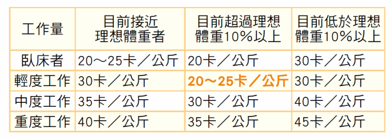 飲食計畫中建議》每日總卡路里目標=現在實際體重(公斤)×每公斤體重需消耗的熱量