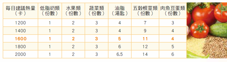 例子:上述表格的建議量是有彈性的,美嘉擔心自己一下子不適應,與營養師討論後,決定每天先吃1600卡,過一陣子再降到1400卡,所以她現在要使用1600卡的份數來排每日的餐次。