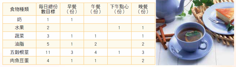 有糖尿病的美嘉有服用降血糖藥,且下午常肚子餓,跟營養師討論後決定一天吃4餐,如下: