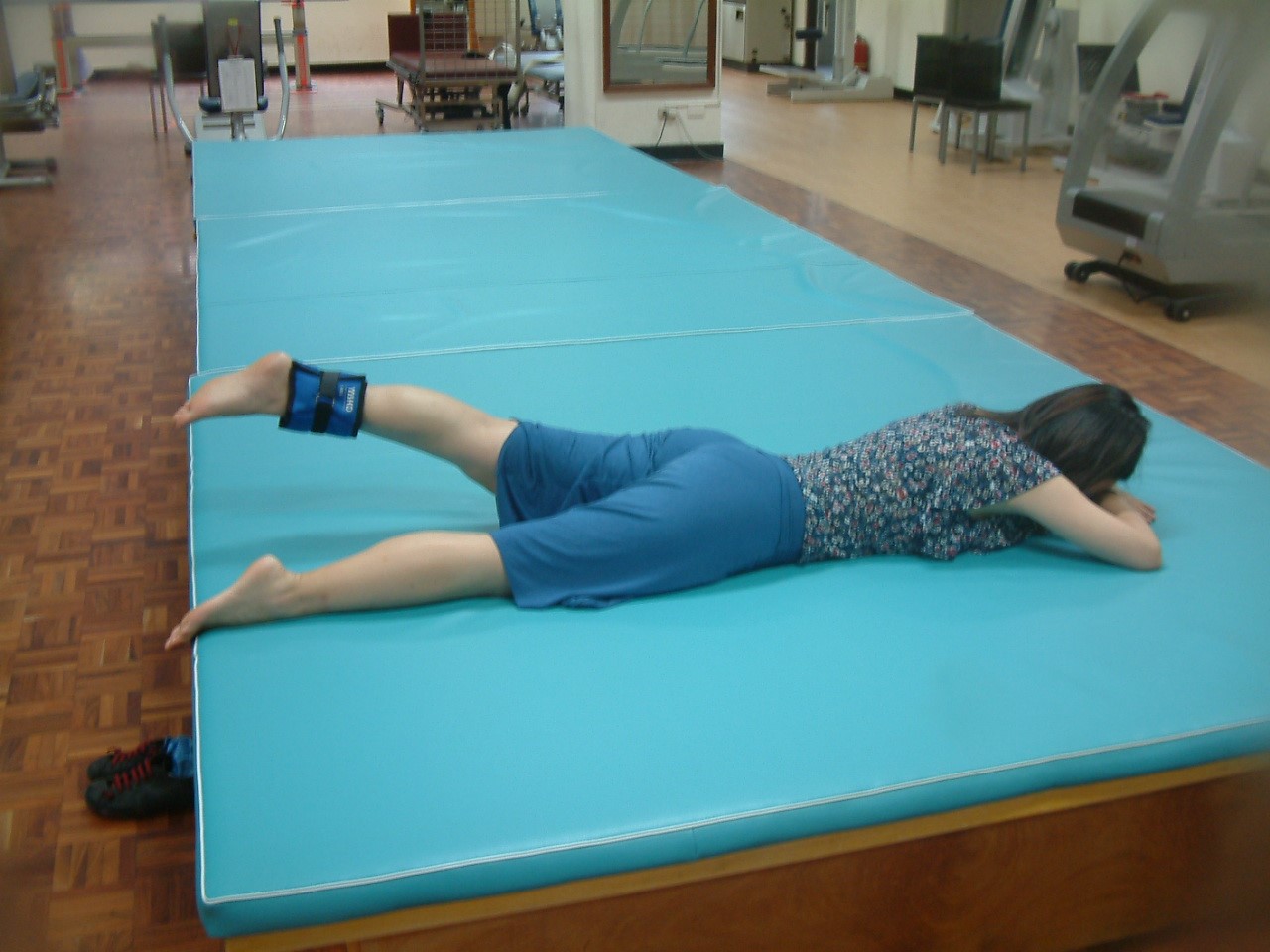 平趴向下,額頭平靠在手背上,單腳向天花板低抬約30~45度。