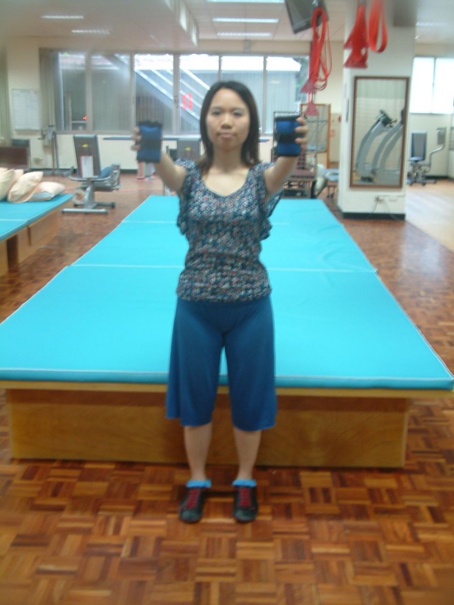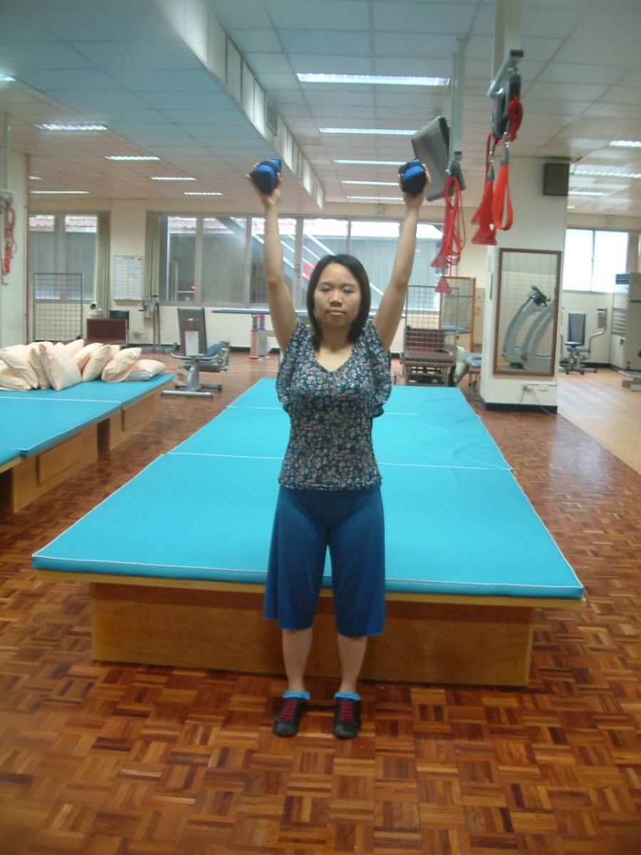舉水瓶或輕沙包,經過胸前向上舉,再放下往兩側舉,最後回到放鬆位置,重複做畫圓動作。